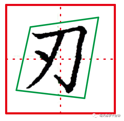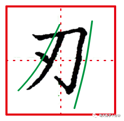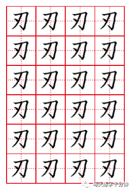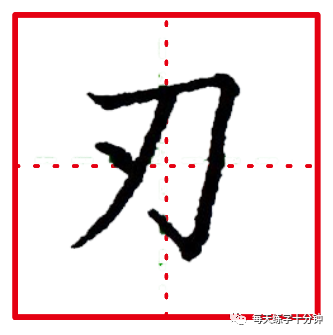 1、“刃”,书写时一定要注意其字形,其字形呈斜势的梯形,头部右倾,底部左高右底,头部左底右高,刚好相反,所以恰好形成了左边短右边长的字形,底部的“钩”一定要略底于“撇”尾部的出锋处
