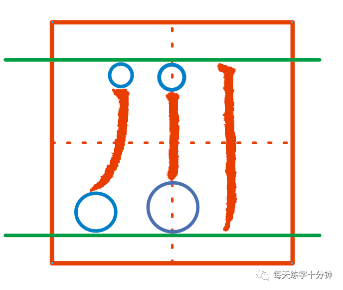 3. 最后两笔一定要直的竖下去,三个笔画之间的左右距离是一样的