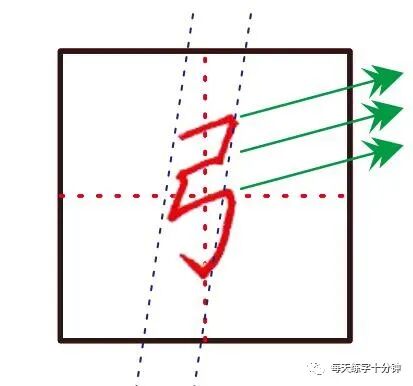 “弓”字有三个横(最后一个横其实叫“折”,但此时我们当作“横”来讲,便于大家理解),三个横都是向右上方同一个角度斜上去写的,最后一个横要写的比中间那个横稍长一点点,三个横之间的距离保持一致,下面那个“钩”的上方要注意空间要空的大一点,整个字取斜势,最后的“钩”刚好在竖中线上